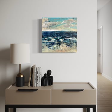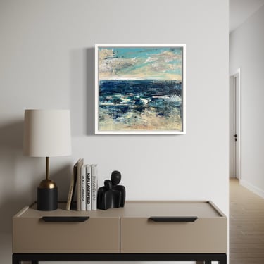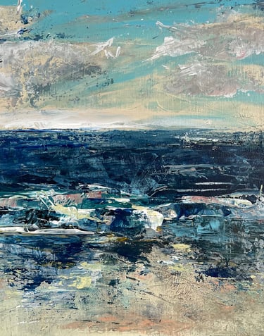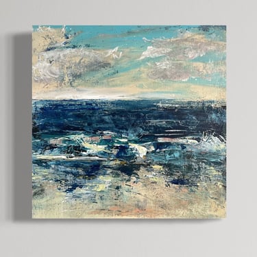 Alum Chine’s beach lies west of Bournemouth and brings a gentle peaceful calm whenever I visit. So whatever the weather, be it a chirpy and crisp winter’s day or a melting hot summer’s day, this sense of peace and happiness sits with me. The pale light yellow, gentle peaches and pinks, is the palette that found it’s way onto this panel, to hone this very feeling.