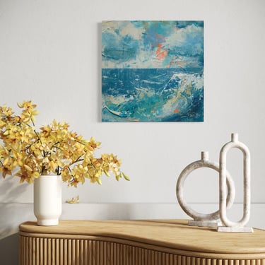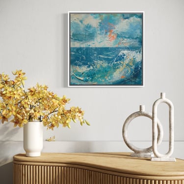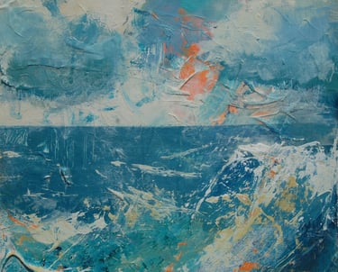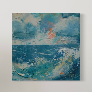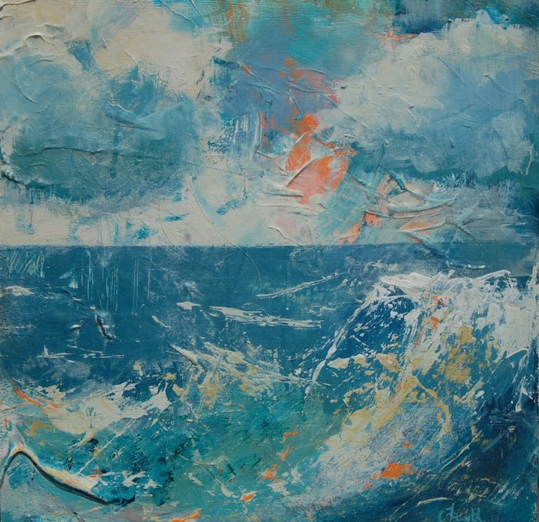 Vibrant cadmium orange peeks though to evoke feelings of excitement culminating in the crash of waves of turquoise blue in the foreground. This is contrasted beautifully with the lure of calm of the still sea towards the ever present, ever constant horizon line.