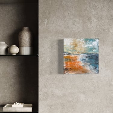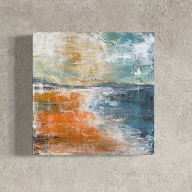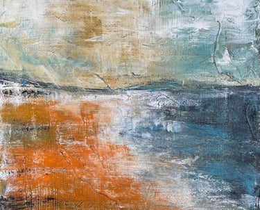 Southbourne, or ‘Sobo’, is an eclectic and energetic borough in Bournemouth. It sits above Southbourne beach where it’s hip and happening vibes are what I connected with when painting this piece. Sometimes it’s not what I see that becomes the painting but what a place makes me feel. The wild cadmium orange, warm earthy tones of yellow ochre and various blues in some way captures the connection between this land, it’s people and it’s vibrant energy.