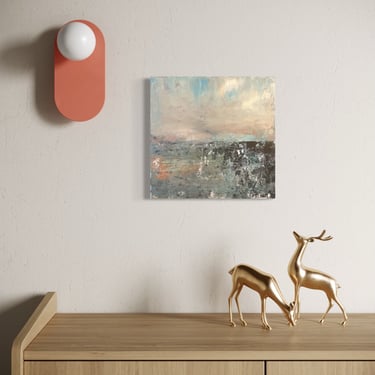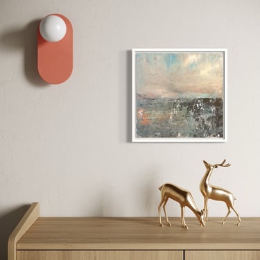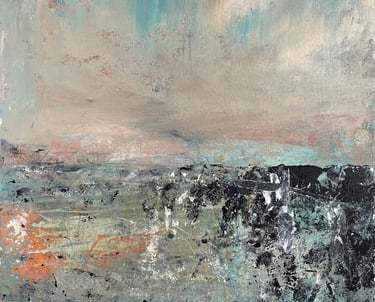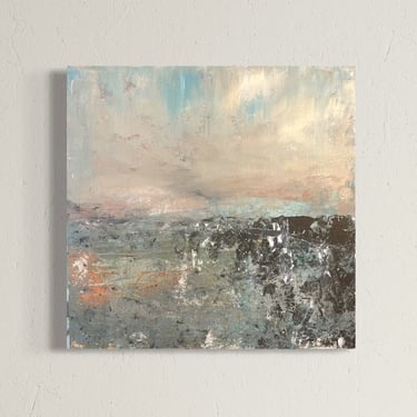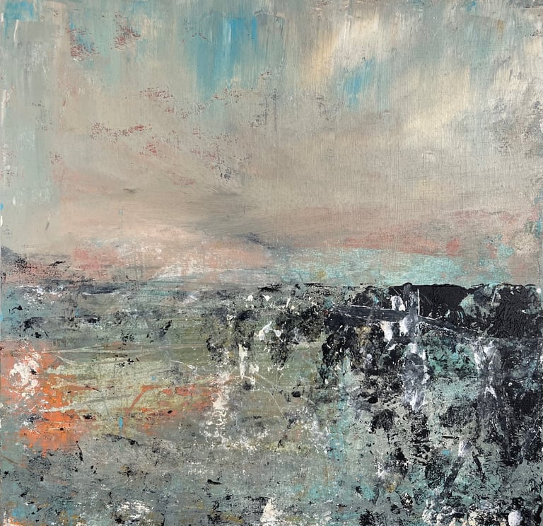 Abstract mark making renders a tempestuous cloud over an abstract coastline, bearing resemblance to Southbourne’s horizon line with a swirling pink sky. The bold black of the sea works as a stark contrast to the otherwise gentle palette of light pinks, light blue and orange.