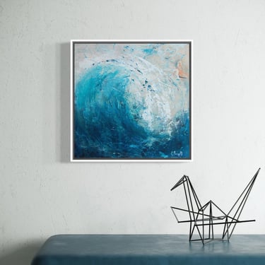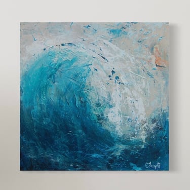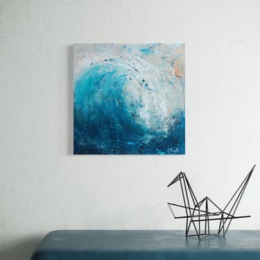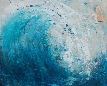Lots of layers create depth, transparency and a luminosity of colours of deep blue and turquoise, as the wave catches light as it breaks.