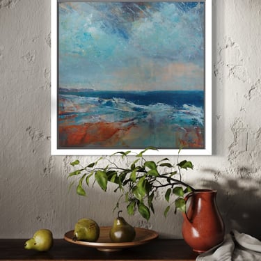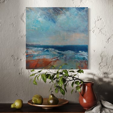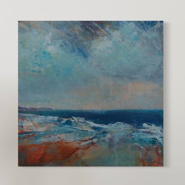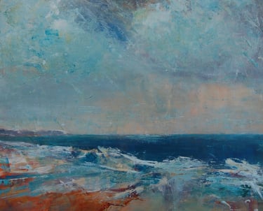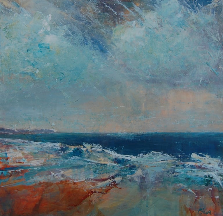 ‘Toward Wight’ evokes feelings of expanse, an opportunity to breathe deeply as we dance with the rhythm of the rolling waves in the foreground. Transparent layers are used to depict the repeated churn of the ocean’s push and pull beat. Looking out beyond the sea towards the Isle of Wight and up into the atmospheric reaches of the open sky.